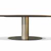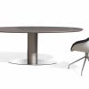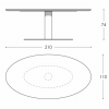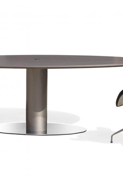 The table features an elliptical oval top table with a 30mm thick table top with with 10mm straight edge and 45º beveled edge on bottom surface. The foot consists of one cylindrical metal column fixed to a round plate support.