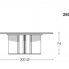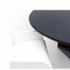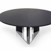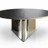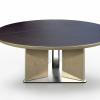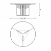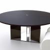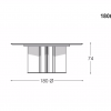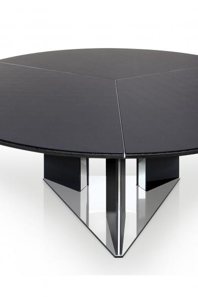 The round tabletop is 30mm thick with a subtle 4mm upholstered cover in Techno Leather divided in 3 pieces and edged with 10mm straight angle and 45º bevel on bottom surface.