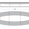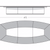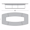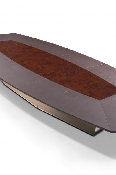 The table features an oval-shaped top with straight ends, the top is divided in two areas: a centre and perimeter, allowing the combination of different materials and finishes.