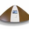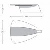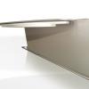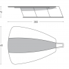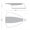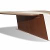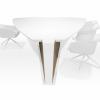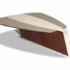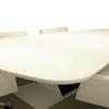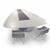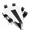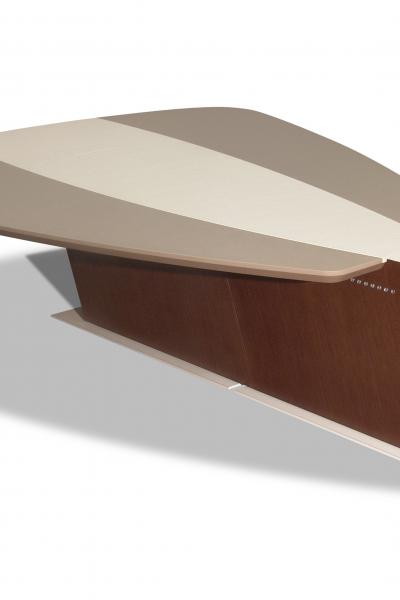 A uniquely shaped meeting table with a drop-shaped top. Its narrower end may resemble a ships bow. The top is divided in three parallel areas which allow for the combination of different materials and finishes. The tabletop is 50mm thick made in two parts: cover and 45º beveled undercover.
