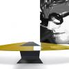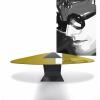The inclined prism-shaped base is made of a metal structure fixed to a metal plate closed with removable panels allowing easy access to the interior of the table for cable managing and maintenance purposes.