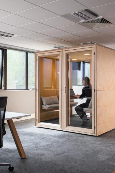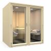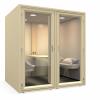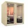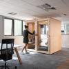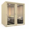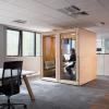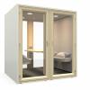 Residence Huddle is a collaborative acoustic booth for up to 4 people. Whether you’re in need of a solitary space for private conversation or high focus working, the modern workspace provides little facility for this, with greater emphasis on open-plan collaborative and social zones, rather than individual spaces for quiet, uninterrupted working. Drawing on the rich design heritage of California, the Residences range creates iconic enclosures within the workplace, providing a serene sanctuary. Inspired by the beautiful ‘residences’, modern, innovative houses built by leading architects throughout the 20th century, these space-efficient pods provide private space using a minimum floor area. The range comes with glazed panels, allowing light to continue to shine through the workspace. The birch plywood finish provides a raw, natural aesthetic contributing towards the need for a sanctuary, inviting people to a serene space through biophilic design. Available as an individual pod, configured for either standing or seated working positions, a private meeting space for two people or now a collaborative meeting space for up to 4 people. The Residences range boasts extremely high acoustic quality, has a constant flow of fresh air with built in air vents and a highly adaptable design with a huge range of finishes options.