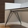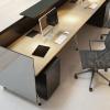 You can choose various widths of linear desks and also specify front/side panels either flush to the floor or with space at the floor level that details the structure of the steel legs.