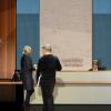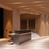 The reception desks upper area is closed as a niche, creating private working space and the outer shelf features a pronounced overhang on one side.